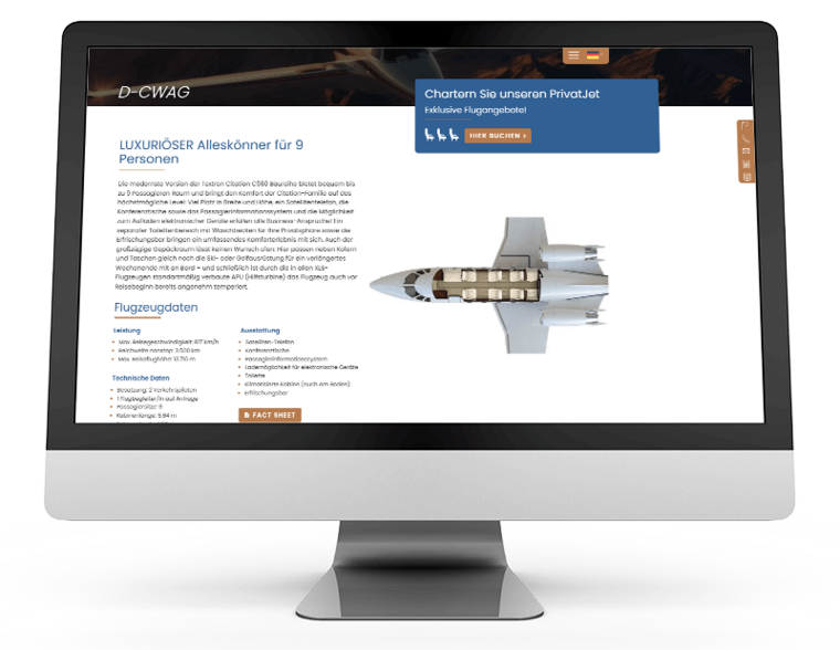Silver Cloud Air, ein Anbieter von exklusiven Privatjet-Charterflügen mit Sitz in Deutschland, stellt höchste Ansprüche an Qualität, Service und Eleganz. Unsere Aufgabe war es, diese Werte durch ein modernes, ansprechendes Webdesign und eine technisch einwandfreie Umsetzung in WordPress widerzuspiegeln.