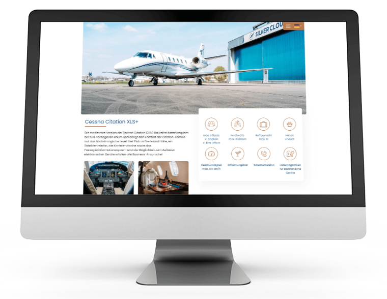 Die neue Website von Silver Cloud Air präsentiert das Unternehmen als modernen und professionellen Anbieter im Bereich Privatjet-Charter. Durch die gelungene Kombination aus Design und Funktionalität wird die Markenbotschaft klar transportiert. Zusätzlich bietet die Plattform eine stabile Basis für zukünftige Marketing- und Kommunikationsmaßnahmen.